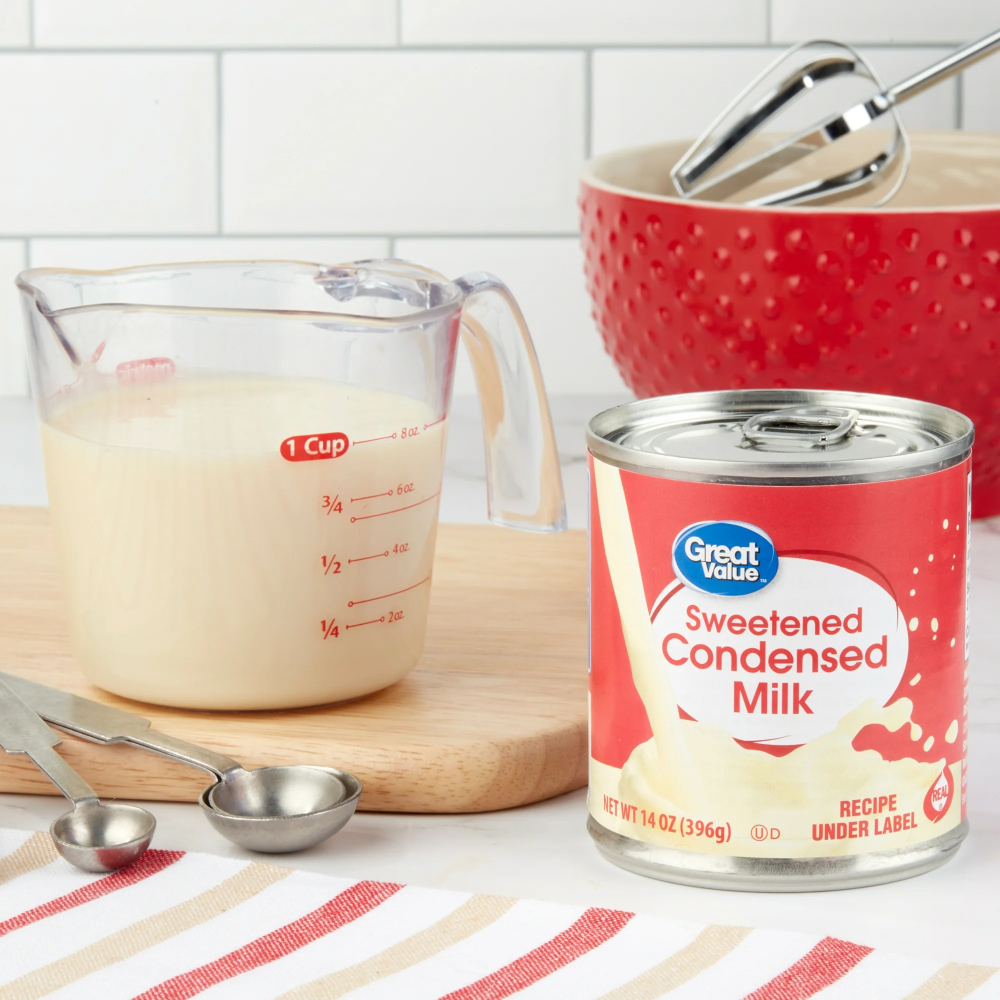 Great Value Sweetened Condensed Milk is a handy ingredient to have for making a wide variety of desserts. The sweet and rich milk is created by reducing milk down to remove water content while adding sugar. The result is a shelf-stable ingredient that can be used in multiple ways, making it an ideal pantry staple for the home cook. Use in tea or coffee for an extra flavorful beverage with minimal effort. Add to mixes for cookies and cakes, or use simply to top ice cream and pies. Drizzle over a bowl of fresh fruit for a lighter dessert. Include the sweetened condensed milk into curries for a spin on the classic coconut milk base. Add to pudding mix for more sweetness. Try making your own ice cream at home by using this condensed milk with fruit. The cooking possibilities are numerous with Great Value Sweetened Condensed Milk.