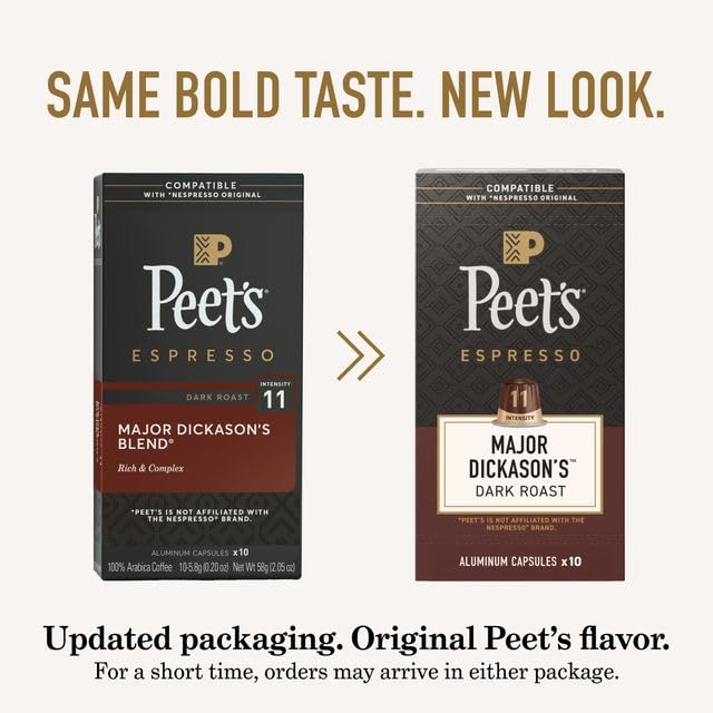 - Contains ten (10) Boxes of 10 Peet’s Major Dickason’s – Intensity 11 Dark Roast Coffee Single Cup Espresso Capsules (100 Espresso Capsules Total)