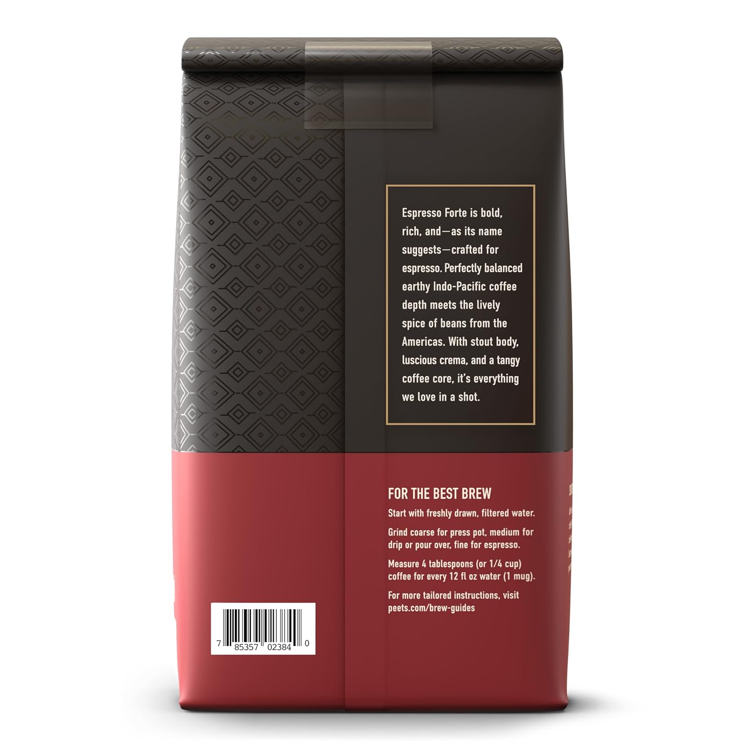 - Contains one (1) 32 Ounce Bag of Peet’s Espresso Forte Dark Espresso Roast Whole Bean 100% Arabica Coffee