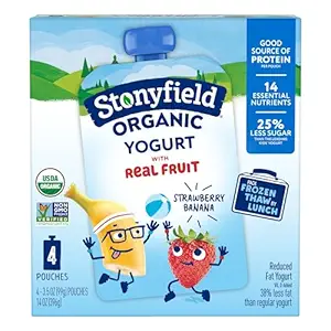 - STONYFIELD ORGANIC Strawberry Banana Reduced Fat Yogurt is the portable super snack for hungry kids. At 3.5 ounces per pouch, it’s the ideal mid-afternoon pick-me-up