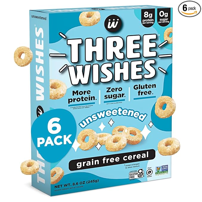 - Gluten & Grain Free Unsweetened Cereal: Start your day off right with delicious, gluten and grain free Three Wishes Cereal. Our unsweetened flavor is a delicious replacement to those sugary cereals you’re used to. Stays crunchy even after you add the milk. 8.6 oz box. 6 Pack.