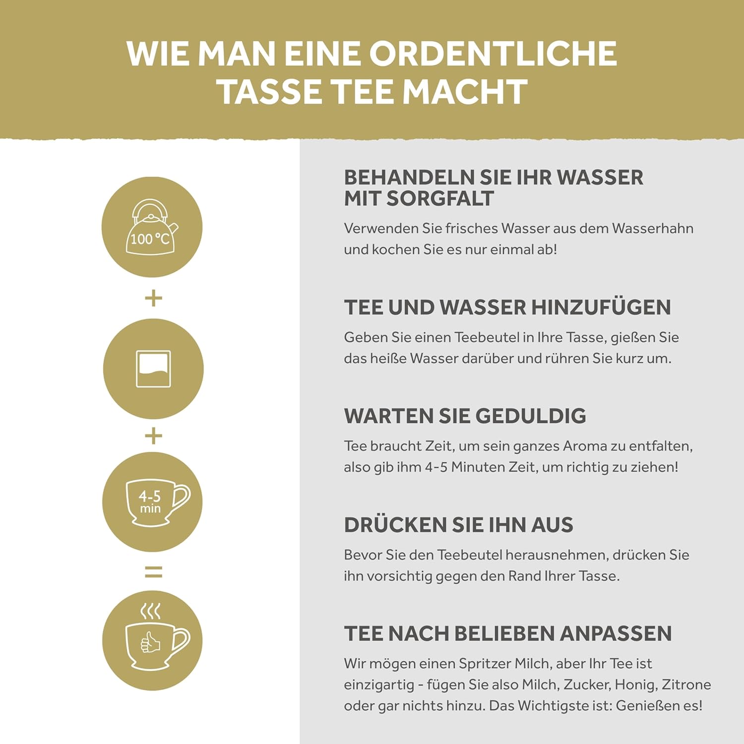 - For the perfect cup use one tea bag. Add freshly boiled water and infuse for 4-5 minutes. Serve pure or with milk.
